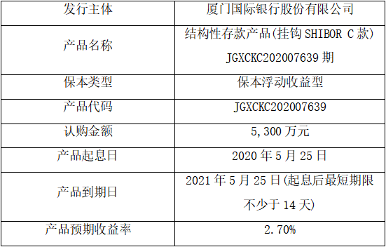 委托理財期限:廈門國際銀行委托理財產(chǎn)品期限為:2020年5月25日~ 2021年5月25日 (起息后最短期限不少于14天)。