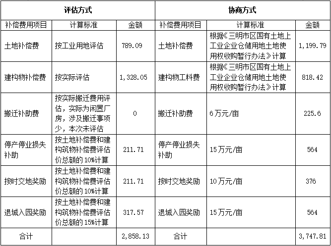 福建省三明齒輪箱有限責(zé)任公司陳大鎮(zhèn)廠區(qū)工業(yè)用地征遷補(bǔ)償方式對比表