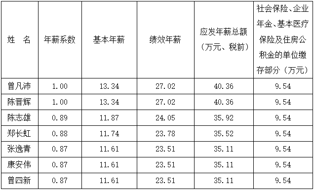 根據(jù)漳州市國(guó)資委及《公司董事長(zhǎng)、經(jīng)理班子年薪方案》的有關(guān)規(guī)定,公司董事長(zhǎng)、經(jīng)理班子的薪酬由基本年薪、績(jī)效年薪、任期激勵(lì)收入三部分構(gòu)成,同意將公司董事長(zhǎng)及經(jīng)理班子人員2019年度薪酬方案修訂如下: