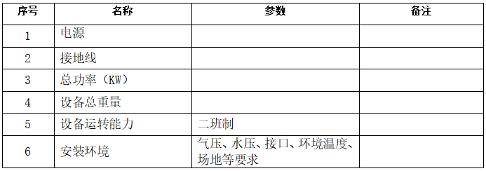 4、設備服務要求:供方在按上述供貨范圍提供設備的同時,須提供與之相應的伴隨服務。包括:技術資料、安裝調試、現場試運行、技術支持、技術服務、技術培訓等,以及在文中未提及的、隱含的其他必須由供方提供的相關服務。