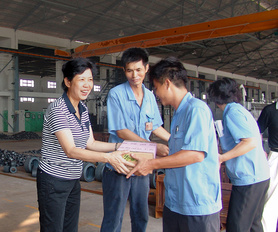2007年7月27日,游婉玲(時任漳州市委常委、統(tǒng)戰(zhàn)部長,左一)到龍軸慰問一線職工
