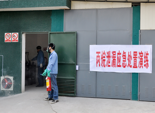 2013年3月14日下午,公司安全管理部按危險(xiǎn)化學(xué)品危險(xiǎn)源監(jiān)控管理要求,在藍(lán)田熱處理車間丙烷、液氨供氣點(diǎn)組織開展 “丙烷泄漏應(yīng)急處置”、“液氨泄漏應(yīng)急處置”兩場演練。